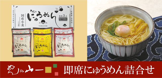 | 原材料 | 即席にゅうめん 和風醤油味: 麺(小麦粉(小麦(国産))、食塩、ごま油、澱粉、(一部に小麦・ごまを含む)) 液体スープ(しょうゆ(国内製造)、かつおエキス、食塩、砂糖、昆布エキス、酵母エキス、さばぶし粉末、かつおぶし、乾しいたけ/酒精、(一部に小麦・大豆・さばを含む)) 乾燥ねぎ(ネギ(国産)/トレハロース) 即席にゅうめん カレー味: 麺:小麦粉(小麦(国産))、食塩、ごま油、澱粉、(一部に小麦・ごまを含む) 粉末スープ:でん粉(国内製造)、食塩、砂糖、カレー粉、野菜粉末(玉ねぎ、にんじん、セロリ、にんにく)、チキンエキスパウダー、酵母エキスパウダー、乾燥ねぎ、(一部に鶏肉を含む) 即席にゅうめん あごだし味: 麺:小麦粉(小麦(国産))、食塩、ごま油、澱粉、(一部に小麦・ごまを含む) 粉末スープ:食塩(国内製造)、デキストリン、糖類(砂糖、ブドウ糖)、わかめ、粉末醤油、酵母エキス、かつお調味粉末、あご(とびうお)、昆布粉末、いわし煮干粉末、かつお節粉末)、(一部に小麦・大豆を含む) |