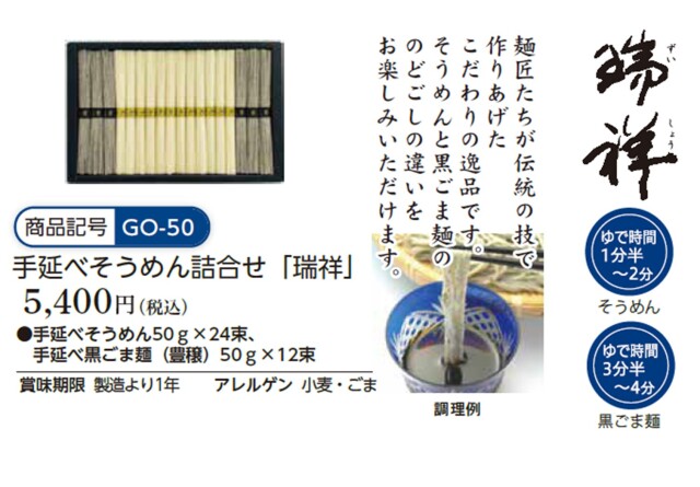 【GO-50】手延べそうめん詰合せ「瑞祥」 そうめん 24束・黒ごま麺 豊穣12束